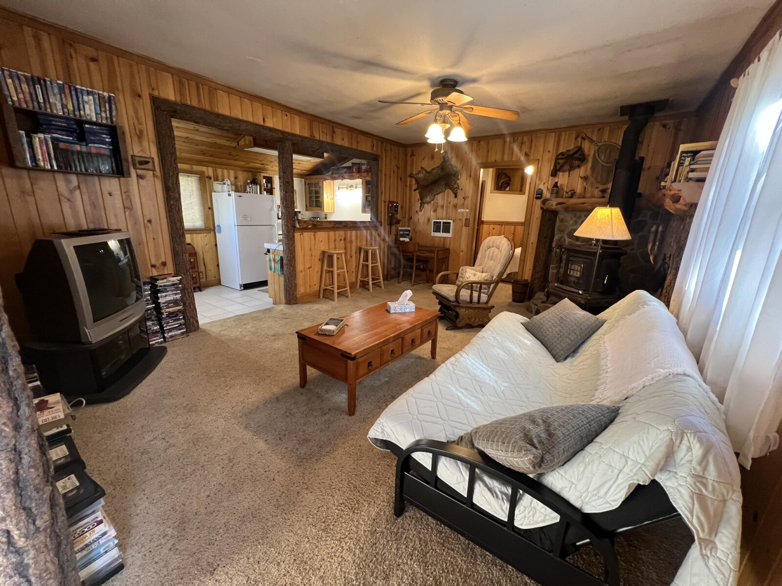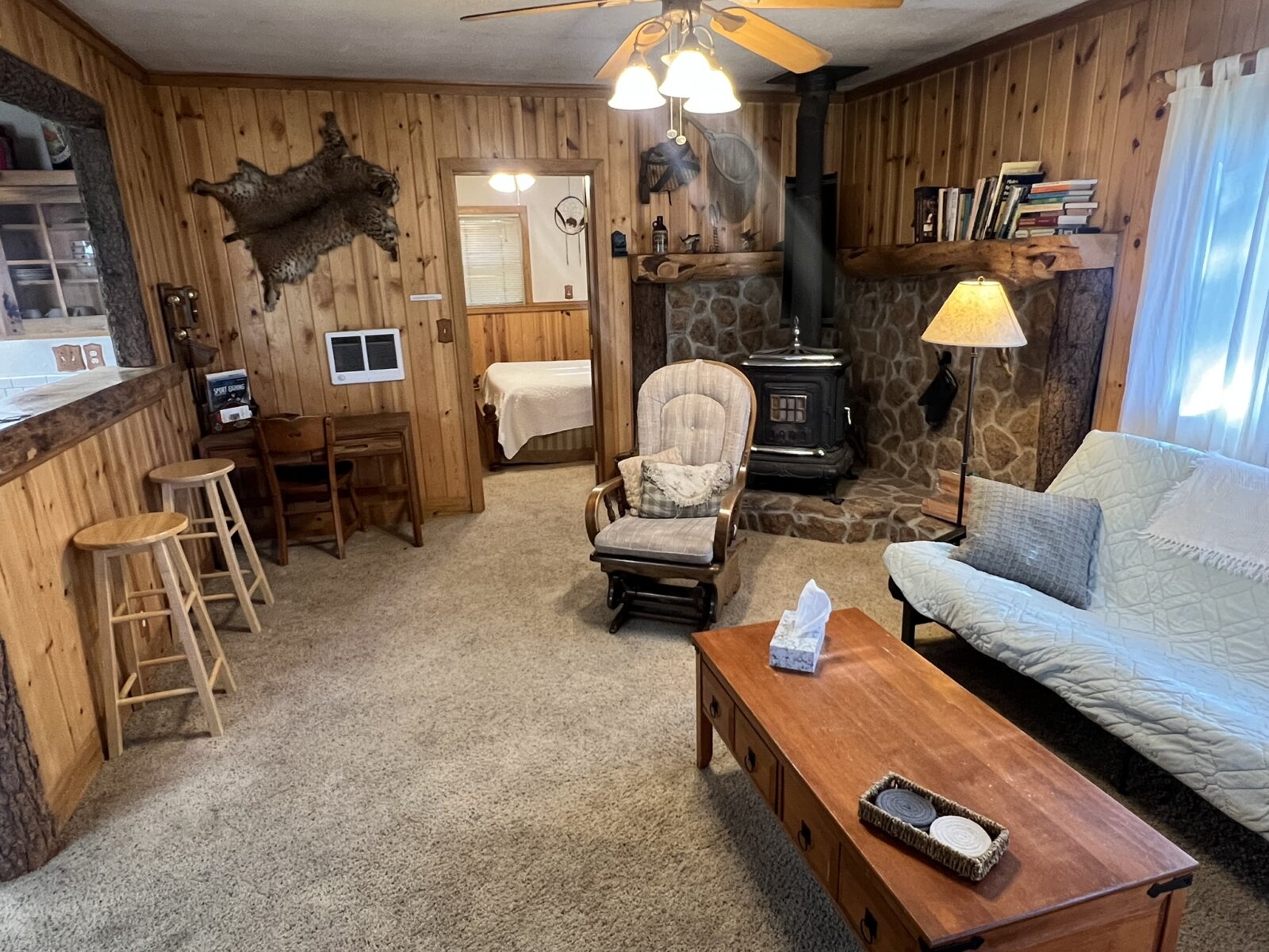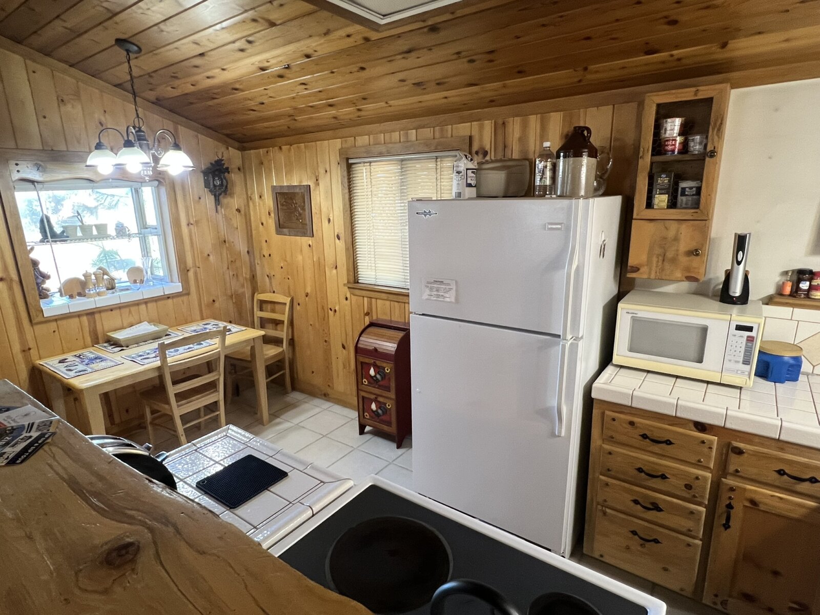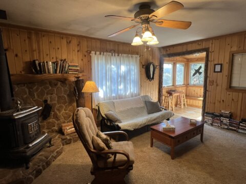 Charming Handcrafted One-Bedroom Cabin with Rustic Elegance. Discover your perfect retreat in this beautifully handcrafted one-bedroom, one-bath cabin, thoughtfully designed with artistic flair and natural materials. Built entirely with care, this cozy home boasts exquisite log accents, rich pine and cedar woodwork, and unique artisanal touches that create a warm and inviting atmosphere. The open-concept living space features tile flooring throughout the kitchen and bath, adding durability and a modern touch to the rustic charm. The fully equipped kitchen offers ample space for cooking and entertaining, complemented by the beauty of natural wood finishes.